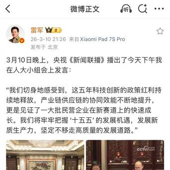 10日晚,雷军晒出《新闻联播》截图,配文“3月10日晚上,央视《新闻联播》播出了今天下午我在人大小组会上发言”。